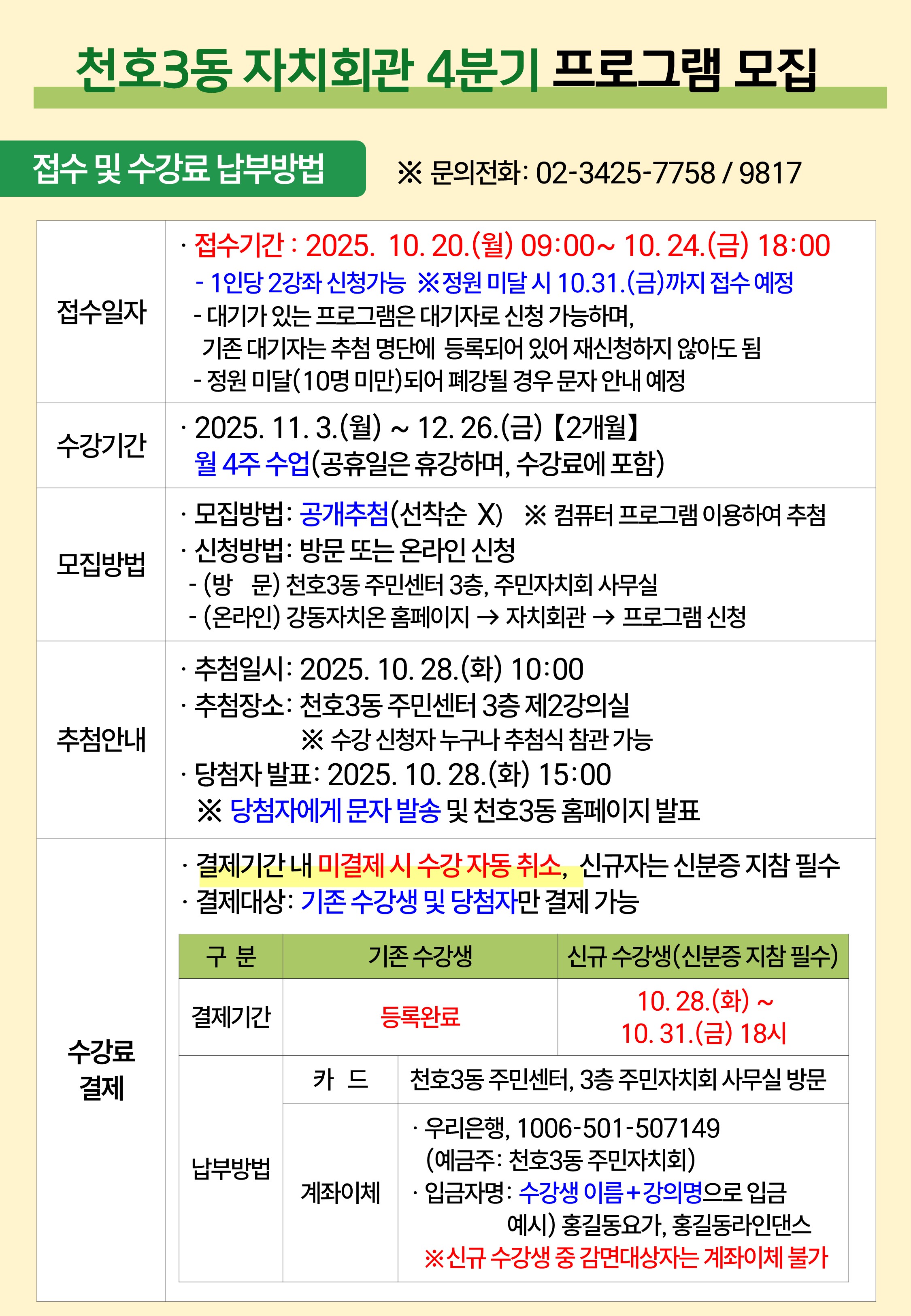 10월 20일(월) ~ 10월 24(금), 천호3동 자치회관 4분기 추가모집 시작합니다. 【신청방법】 ○ 방문: 천호3동 주민센터 3층, 주민자치회 사무실 ○ 온라인: 강동자치온(https://jumin.gangdong.go.kr/main/Main.do) → 자치회관 →프로그램 신청 |