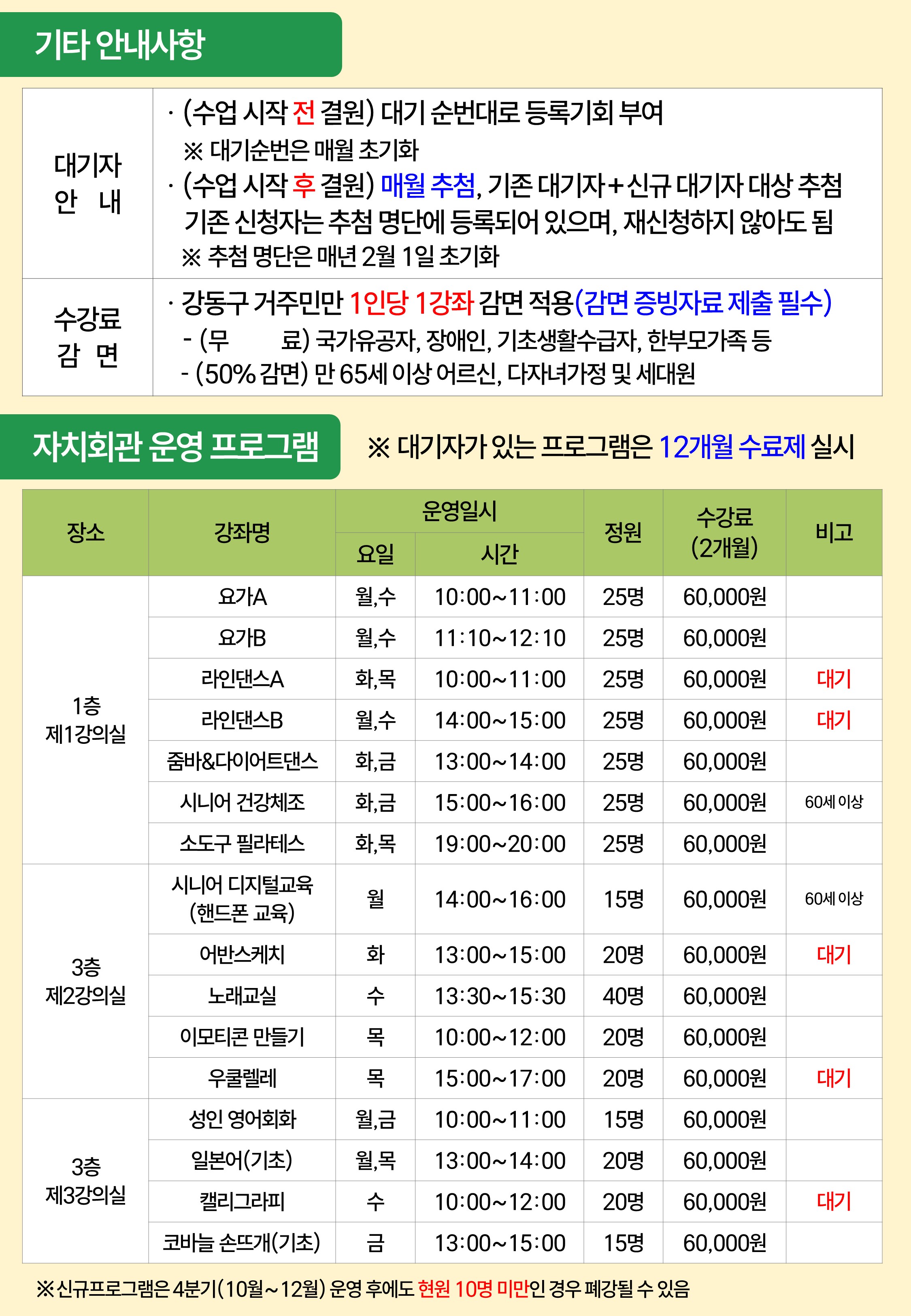 제목 | 4분기 자치회관 프로그램 수강생 추가 모집 | ||