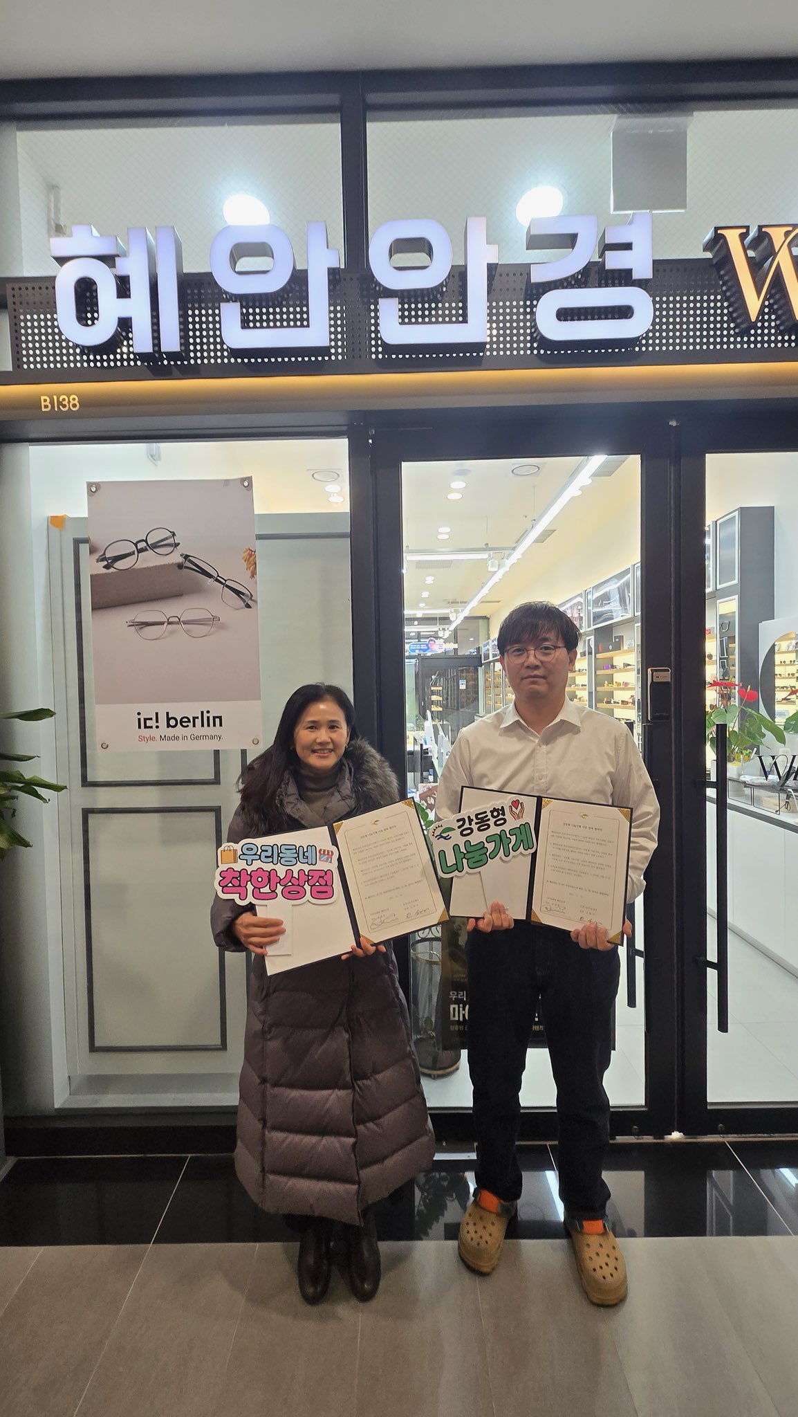 우리 동네 착한 나눔가게 2호점은 혜안안경(대표: 김철홍)입니다. 둔촌주공아파트 시절부터 동네분들에게 좋은 이미지를 쌓고 있는 안경점이라고 합니다. 강동종합사회복지관을 통해 안경(돋보기)이 필요한 분들을 추천받아서 월 10만원 한도까지 안경(돋보기) 후원을 해주기로 하셨어요. 감사합니다. (사진: 오헌아 동장, 김철홍 대표)